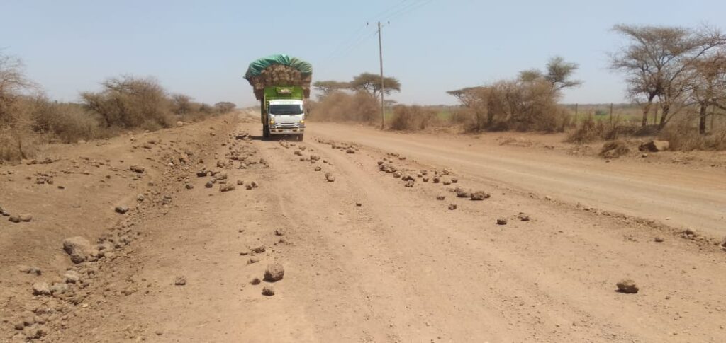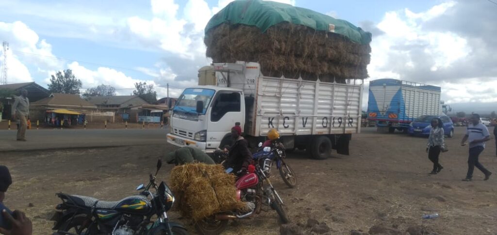 Ich habe mich sofort mit Hilfe von Lehrer Philip um die Beschaffung von Heu gekümmert. Es kommt aus einem weit entfernten Gebiet nördlich des Mt. Kenya, die Lastwagen haben eine abenteuerliche Fahrt mit den hochbeladenen Fahrzeugen zu bewältigen. Die letzte Herausforderung ist die Sandstraße, die von der geteerten Hauptstraße zu den Siedlungen von Lemong’o führt. Sie war bei unserem Besuch im August schon in katastrophalem Zustand und ist jetzt praktisch nicht mehr befahrbar. Die Männer mussten erst eine Trasse für den LKW anlegen.